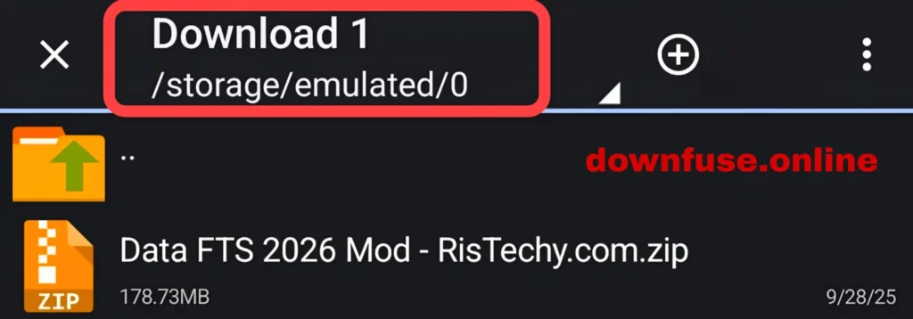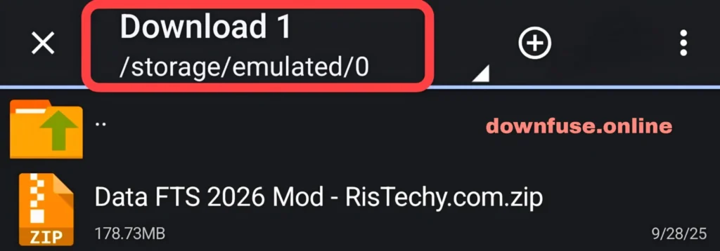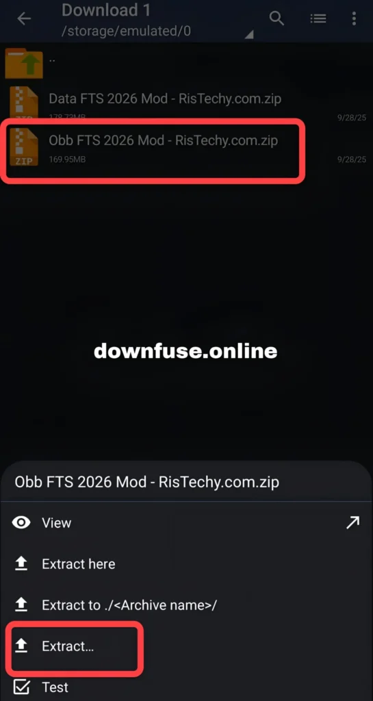 - Open the ZArchiver app that you installed on your device. Navigate to the folder where the “Data FTS 2026” ZIP or RAR file is located. Tap on the file, and a menu will appear with several options. From the menu, select the “Extract” option to begin the extraction process.